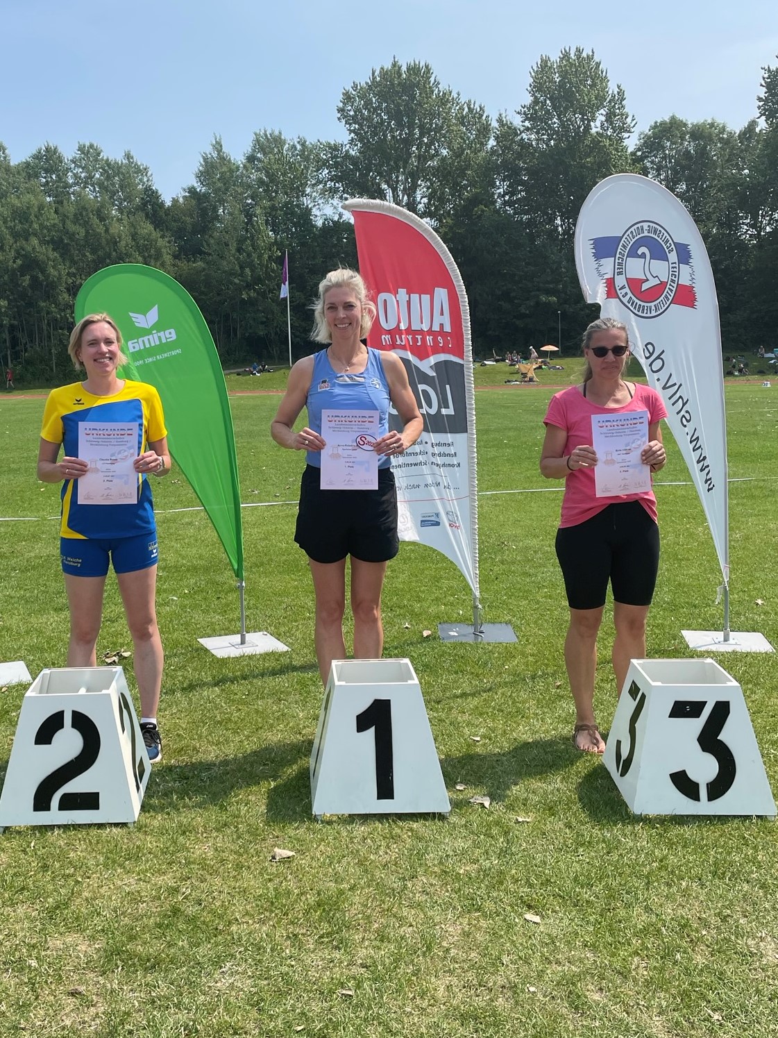 Vergangenen Sonntag trafen sich die Männer und Frauen der Altersklassen M/W 30 – M/W 85 im Kieler Universitätsstadion in der Olshausenstraße, um die gemeinsamen Landesmeister der jeweiligen Altersklassen zu ermitteln. Es gibt nicht allzu viele Möglichkeiten im Jahr, sich innerhalb einer Altersklasse in den Disziplinen auf der Bahn oder in den technischen Wettbewerben der gleichaltrigen Konkurrenz zu stellen und Wettkämpfe auf Augenhöhe zu bestreiten. Daher freute ich mich über die Meldung in gleich zwei Disziplinen, dem 800m und dem 400m-Lauf. Die Veranstaltung startete pünktlich um 11.00 Uhr bei bereits hochsommerlichen Temperaturen von 28 Grad im Schatten. Der erste Lauf, die 800m, waren für 13.00 Uhr angesetzt. Mittagshitze! Mit Katrin Jöde-Rönck von der TSG Wittenburg (W40) habe ich mich gemeinsam auf den Lauf vorbereitet, alles moderat angesichts der Temperaturen. Die 800m-Distanz der Frauen wurde dann in zwei Läufe unterteilt, die jeweils mehrere Altersklassen umfassten. Lauf 1: W 30 – W45, Lauf 2: W50 – W75. Erst kurz vor dem Start begaben wir uns aus dem Schatten heraus in Richtung Startaufstellung. Dann ging es los. Wohlwissend, dass bei diesen Temperaturen auch 800m sehr lang werden können, war das Anfangstempo eher mäßig. Da Katrin vor ein paar Wochen eine Zeit um die 2:41 min im Rostocker Leichtathletikstadion gelaufen ist, habe ich ihr heute den Vortritt gelassen und mich von Anfang an, ungefähr eine Schrittlänge, hinter ihr eingeordnet. Justyna Kwiatkowska (W35) und Laura Czech (W30) von der TSG Bergedorf haben wir dabei gerne die Führung überlassen. Die beiden waren von Beginn an etwas schneller unterwegs. Hinter mir lief Claudia Reese (W45) von der LG Flensburg, die am Rand der Strecke kräftig angefeuert wurde, und Birte Völkner (W45) von HNT Hamburg. Die Durchgangszeit von Katrin und mir bei 400m war 1:23 min, jetzt hieß es für die zweite Runde, wenn möglich, noch etwas mehr rausholen, aber zumindest nicht nachlassen. Ich konnte das Tempo trotz der hohen Temperaturen halten und die Schritte zum Schluss auch nochmal länger werden lassen, was mir im gesamten Lauf den dritten Platz und in meiner Altersklasse (W45) sogar den Sieg und auch den Landesmeistertitel eingebracht hat. Riesige Freude! Die Zielzeit von 2:46, 34 min war dabei nur nebensächlich. Doch nach dem Lauf ist vor dem Lauf.