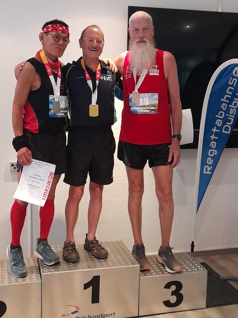 Bei hochsommerlichen Temperaturen und perfekter Stimmung holte der fast 70-jährige Mecklenburger Klaus-Dieter Mauck, am Samstag, den 15.7. 23, die Bronzemedaille bei den Deutschen Meisterschaften im 50 km Lauf in der Klasse der über 70-jährigen Männer, nach sehr starken 5;47,27 Stunden. Ausgetragen wurden die Meisterschaften in diesem Jahr in Duisburg rund um die Regattabahn.