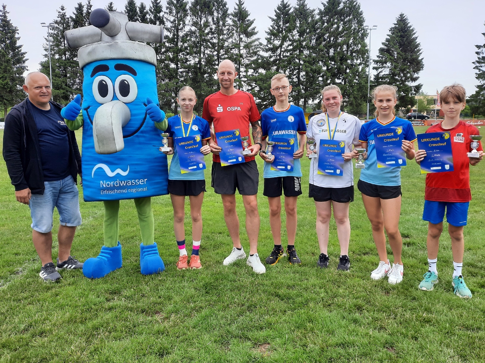 Die erfolgreichen Laager Ausdauersportler von links: Pia, Marcel, Lennox, Denise, Florentine und Erik. Gemeinsam mit dem Masskottchen der Veranstaltung und Herrn Steinbrückner vom Unternehmen Nordwasser. Foto: A. Stache